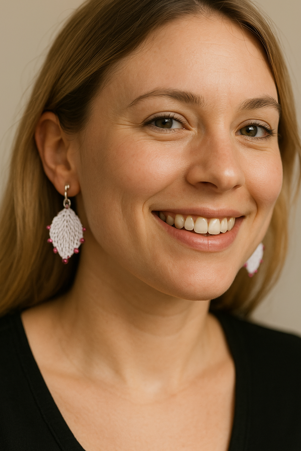 These delicately crocheted white leaf earrings are finished with flirty blush-pink beads for a touch of sparkle.