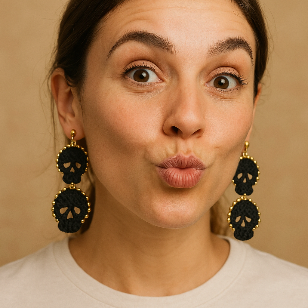 These hand-crocheted black skulls are framed with gleaming gold beads and stacked for dramatic impact.