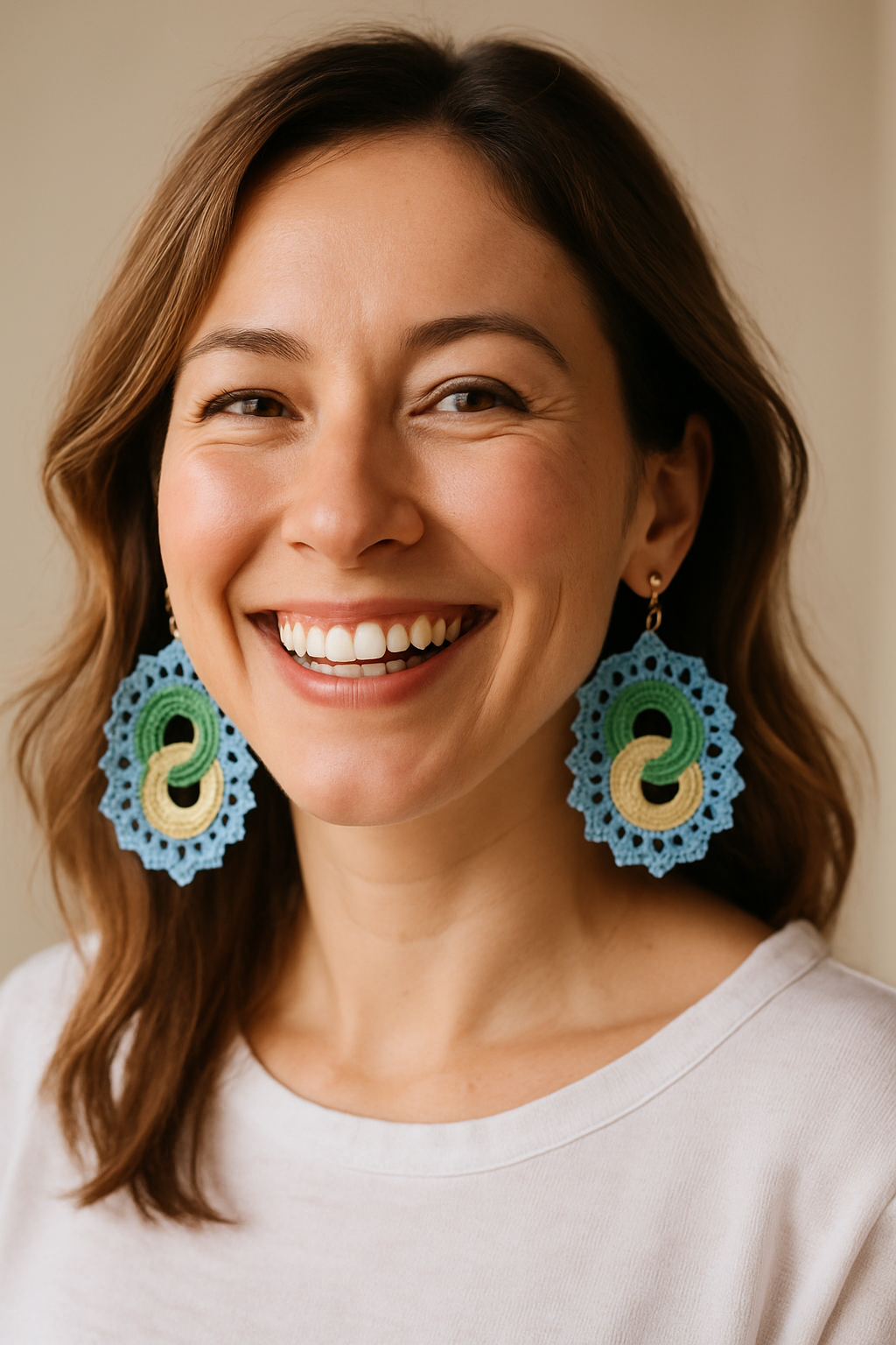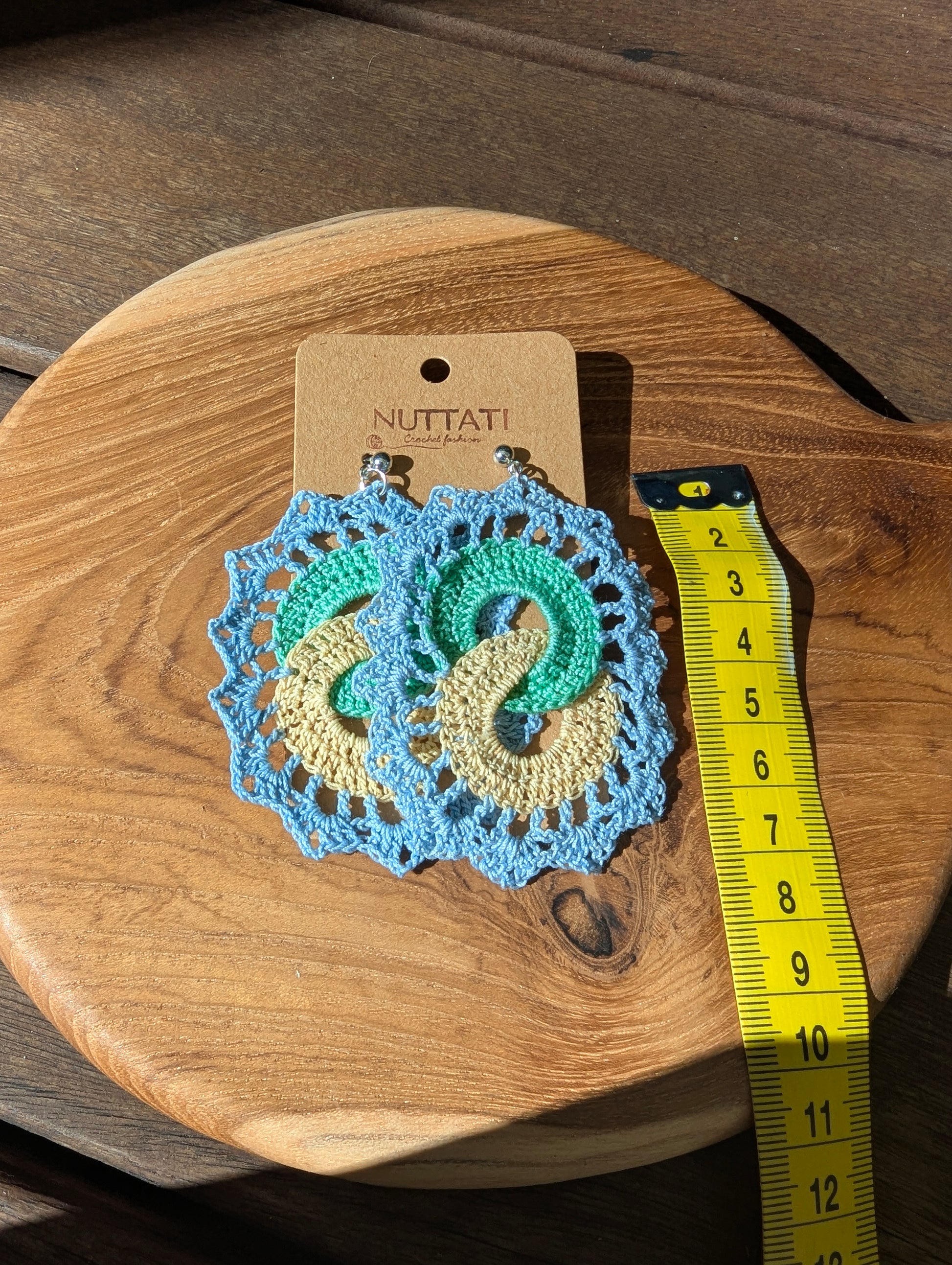 A bold symbol of balance and flow, these earrings feature interlocking crochet spirals in sunny yellow and lush green, framed by a delicate sky-blue lace edge.