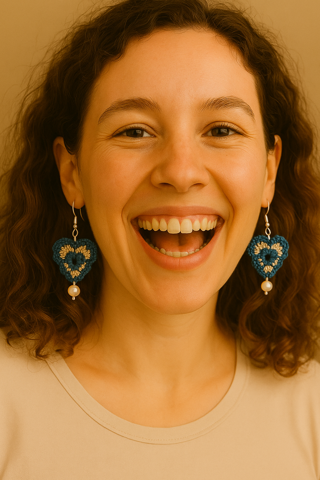 Soft and cheeky, these heart-shaped crochet earrings mix midnight blue and sandy beige in a playful pattern—finished with a single blush pearl drop.