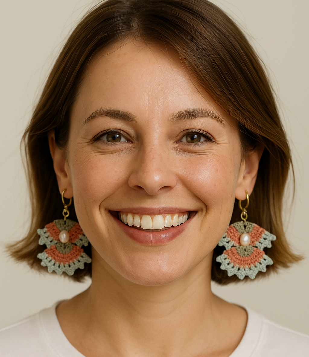 Elegant and eye-catching, these statement earrings feature soft fan-shaped layers in earthy coral, sage, and sky blue crochet—finished with a luminous freshwater pearl at the center.