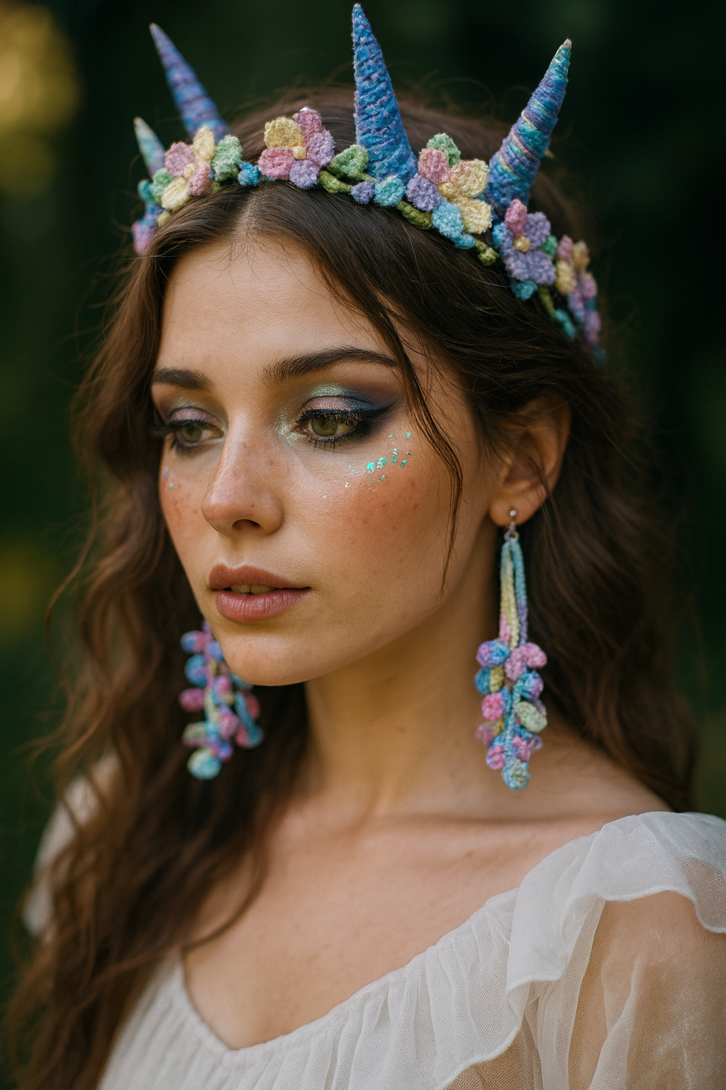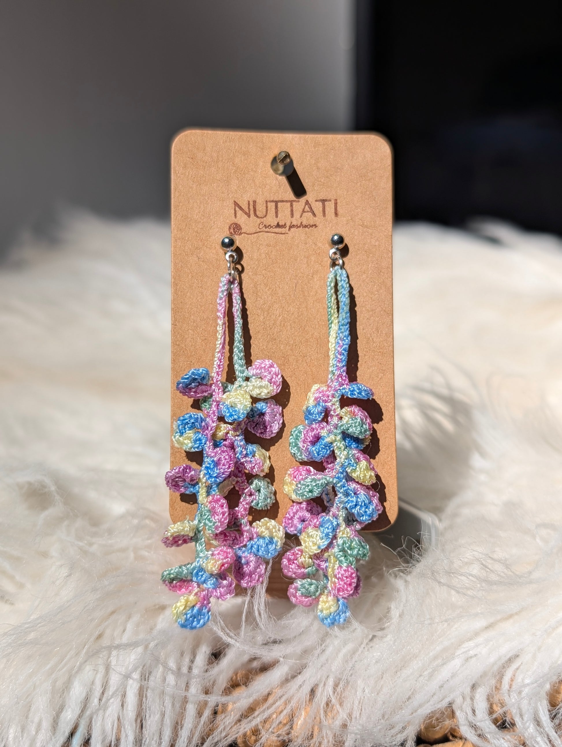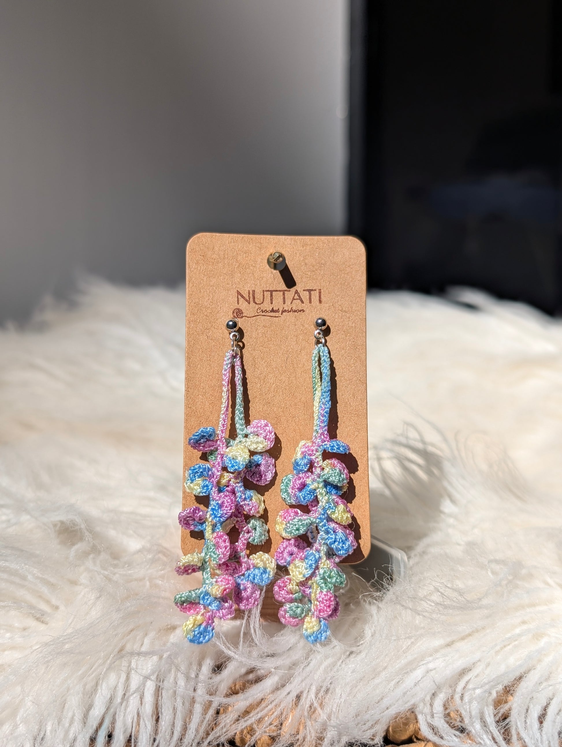 Delicately hand-crocheted with cascading pastel blooms, these earrings capture the magic of a garden in full bloom. Soft shades of lilac, sky blue, mint, and butter yellow flow together in a dreamy palette that feels both whimsical and timeless. Light as air yet full of movement, they’re designed to sway gracefully with every step—bringing a touch of fantasy to your everyday.