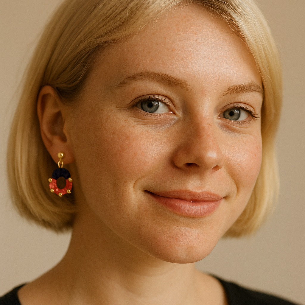 Bold and playful, these earrings feature a navy-blue crochet block that seamlessly transitions into a loop woven from variegated coral and pastel pink yarn, accented with gleaming gold beads. Lightweight and versatile, the Hoop Drops hang from polished gold studs for a contemporary touch. Perfect for adding a pop of color and artisan flair to both casual and evening ensembles.
